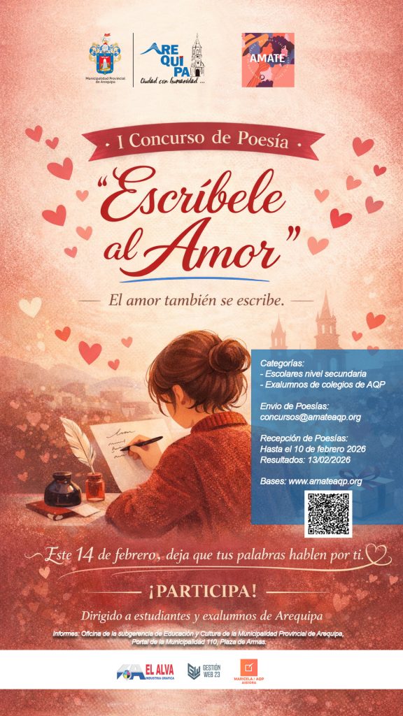 La Asociación de Mujeres con Amor y Talento Logran el Éxito – AMATE, en coorganización con la Municipalidad Provincial de Arequipa, presenta el I Concurso de Poesía “Escríbele al Amor”, una iniciativa cultural que invita a estudiantes de nivel secundaria y exalumnos de colegios de Arequipa a expresar, a través de la poesía, el amor en todas sus formas.